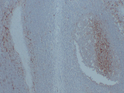 Immunohistochemistry analysis of paraffin-embedded Tonsil using CD14 antibody. High-pressure and temperature Sodium Citrate pH 6.0 was used for antigen retrieval.