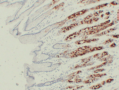 Immunohistochemistry analysis of paraffin-embedded Stomach using Gastric Mucin antibody.High-pressure and temperature Sodium Citrate pH 6.0 was used for antigen retrieval.