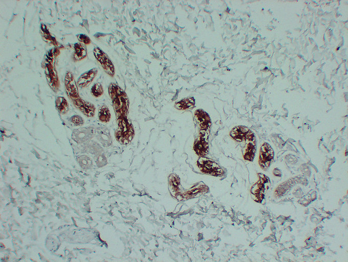 Immunohistochemistry analysis of paraffin-embedded Human Skin using GCDFP 15 antibody.High-pressure and temperature Sodium Citrate pH 6.0 was used for antigen retrieval.
