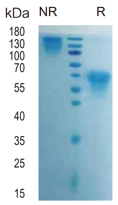 4 ug/lane protein was resolved with SDS-PAGE under non-reducing (NR) and reducing (R) conditions and visualized by Coomassie Blue staining.