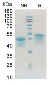4 ug/lane protein was resolved with SDS-PAGE under non-reducing (NR) and reducing (R) conditions and visualized by Coomassie Blue staining.