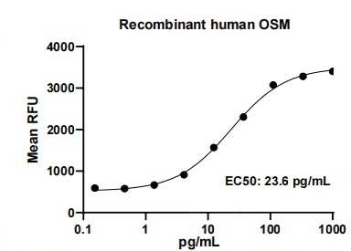 抑瘤素M(OSM)是一种生长分化因子,参与神经发生、成骨和造血的调控。它刺激成纤维细胞、平滑肌细胞和卡波西肉瘤细胞的增殖,但抑制一些正常和肿瘤细胞系的生长,它还促进内皮细胞释放细胞因子(如IL-6、GM-CSF和g-CSF),并增强肝癌细胞中低密度脂蛋白受体的表达。OSM由活化的T细胞、单核细胞和卡波西肉瘤细胞产生,对细胞增殖具有刺激和抑制作用。