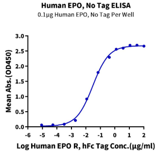 Immobilized Human EPO Protein at 1μg/ml (100μl/well) on the plate. Dose response curve for Human EPO R, hFc Tag with the EC50 of 29.7ng/ml determined by ELISA.