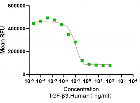 TGFβ3是TGF-β超家族亚群的成员,其定义由其结构和功能相似性决定。TGF-β3和β1、β2充当细胞开关,以调节免疫功能,细胞增殖和上皮-间充质转变。人TGF-β3 cDNA编码412 aa前体,其含有20 aa信号肽和392 aa蛋白。成熟的人TGF-β3分别与小鼠/狗/马,大鼠和猪TGF-β3有100%,99%和98%的同源性。TGF-β3与TGF-βRII(一种 II 型丝氨酸/苏氨酸激酶受体)具有高亲和力。该受体磷酸化并激活I型丝氨酸/苏氨酸激酶受体TGF-βRI或ALK-1,以通过Smad磷酸化调节转录。