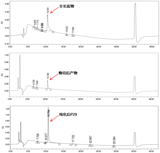 图1. 翌圣Kex2酶&羧肽酶B(Cat#20417ES)酶切P29-Arg34GLP-1(9-37),适配串联工艺需求,产量高,纯度高