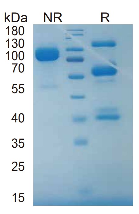 2 ug/lane protein was resolved with SDS-PAGE under non-reducing (NR) and reducing (R) conditions and visualized by Coomassie Blue staining.