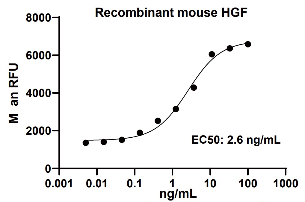 Hepatocyte Growth Factor(HGF), also known as Scatter Factor and Hepatopoietin A, is a pleiotropic protein in the Plasminogen subfamily of S1 peptidases. It is a multidomain molecule that includes an N-terminal PAN/APPLE-like domain, four Kringle domains, and a serine proteinase-like domain that has no detectable protease activity (1 - 5). Mouse HGF is secreted as an inactive 728 amino acid (aa) single chain propeptide. It is cleaved after the fourth Kringle domain by a serine protease to form bioactive disulfide-linked HGF with a 60 kDa alpha and 30 kDa beta chain.