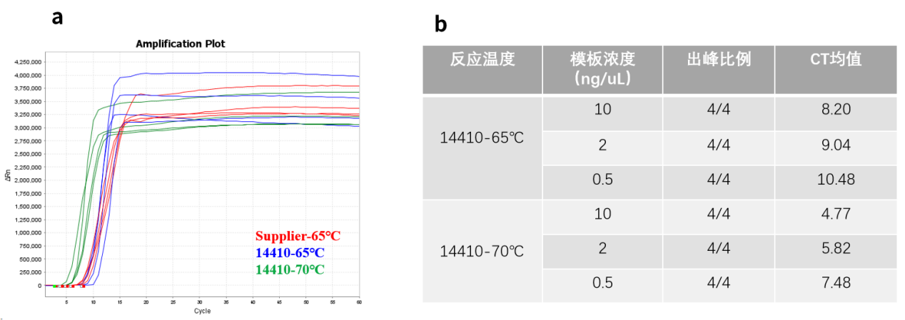 以gDNA为模板,搭配翌圣13762的buffer体系,考察14410在65℃和70℃的扩增能力。图a添加量为2ng/uL的模板,图b模板浓度梯度降低,结果表明:14410可耐受70℃的LAMP反应,且提高温度,检测Ct值显著缩小,表明耐热Bst酶可进一步提升体系的灵敏度。