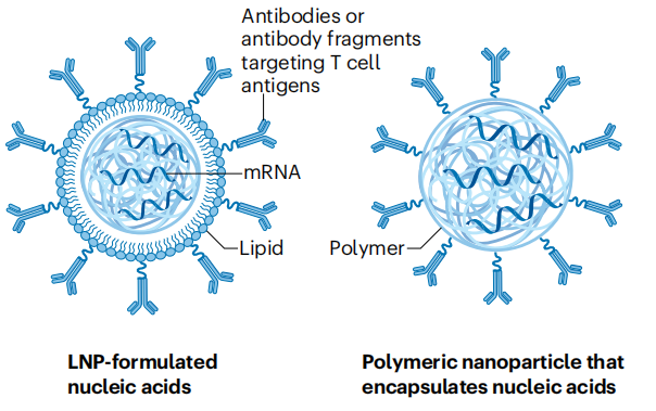 非病毒载体纳米系统,其中阳离子聚合物纳米颗粒和脂质纳米颗粒(LNP)是常用载体。以脂质体RNA递送系统为例:通过化学修饰在脂质体表面偶联抗体或者scFV,将CAR蛋白的mRNA特异性的递送至T细胞胞质。相较于慢病毒载体,mRNA不会整合至宿主基因组中,从某种程度上增强了CAR-T细胞治疗的安全性。
