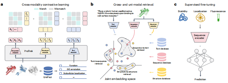 不同编码器分工合作(上图a),通过三模态对比学习,统一序列、结构和功能的语义空间。