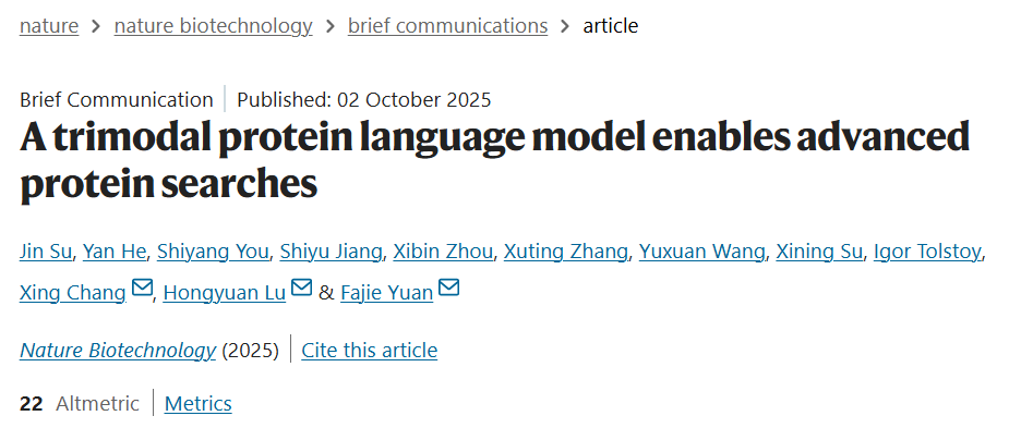 2025年10月2日,西湖大学原发杰、常兴教授团队联合香港科技大学(广州)卢泓远教授团队在Nature Biotechnology(IF=41.7)上发表了文章A tri-modal protein language model enables advanced protein searches,推出了三模态蛋白质语言模型Pro Trek。该模型首次将蛋白质的三种核心信息——氨基酸序列(一维)、三维结构(空间)和自然语言功能描述(语义)——融合于一个统一的语言模型中。