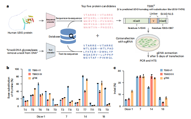 对搜索到的Top候选蛋白进行工程化改造(模仿UDG的Y147A突变),并构建成新型碱基编辑器。实验证明,其中排名第一的蛋白变体 (V1) 在多个基因组位点展示了高于现有编辑器(如TSBES EK, gTBE)的胸腺嘧啶编辑效率,且脱靶率更低。