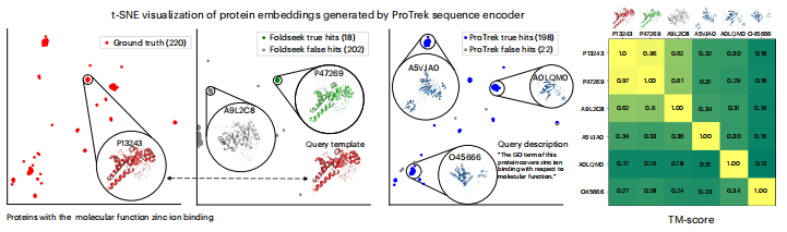 以“锌离子结合”为查询时,Foldseck(基于结构)仅找到18个真实相关蛋白,而Pro Trek找到了198个。上图右侧的TM-score矩阵图清晰地显示,这些被Pro Trek找出的蛋白,结构多样性极高(TM-score很低),但它们都共享“锌离子结合”这一功能。