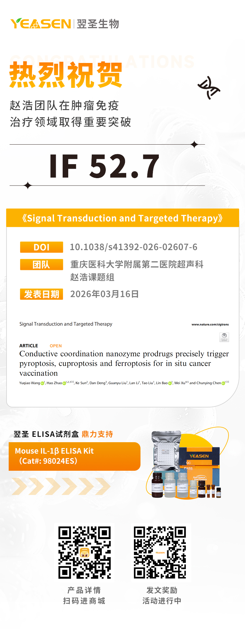翌圣ELISA产品助力肿瘤免疫治疗新突破:导电纳米酶诱导原位肿瘤疫苗”