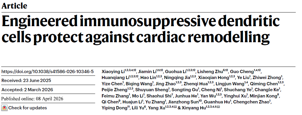 2026 年 4 月 8 日,浙江大学医学院附属第二医院胡新央、徐洋团队于Nature发表原创研究,题为Engineered immunosuppressive dendritic cells protect against cardiac remodelling。